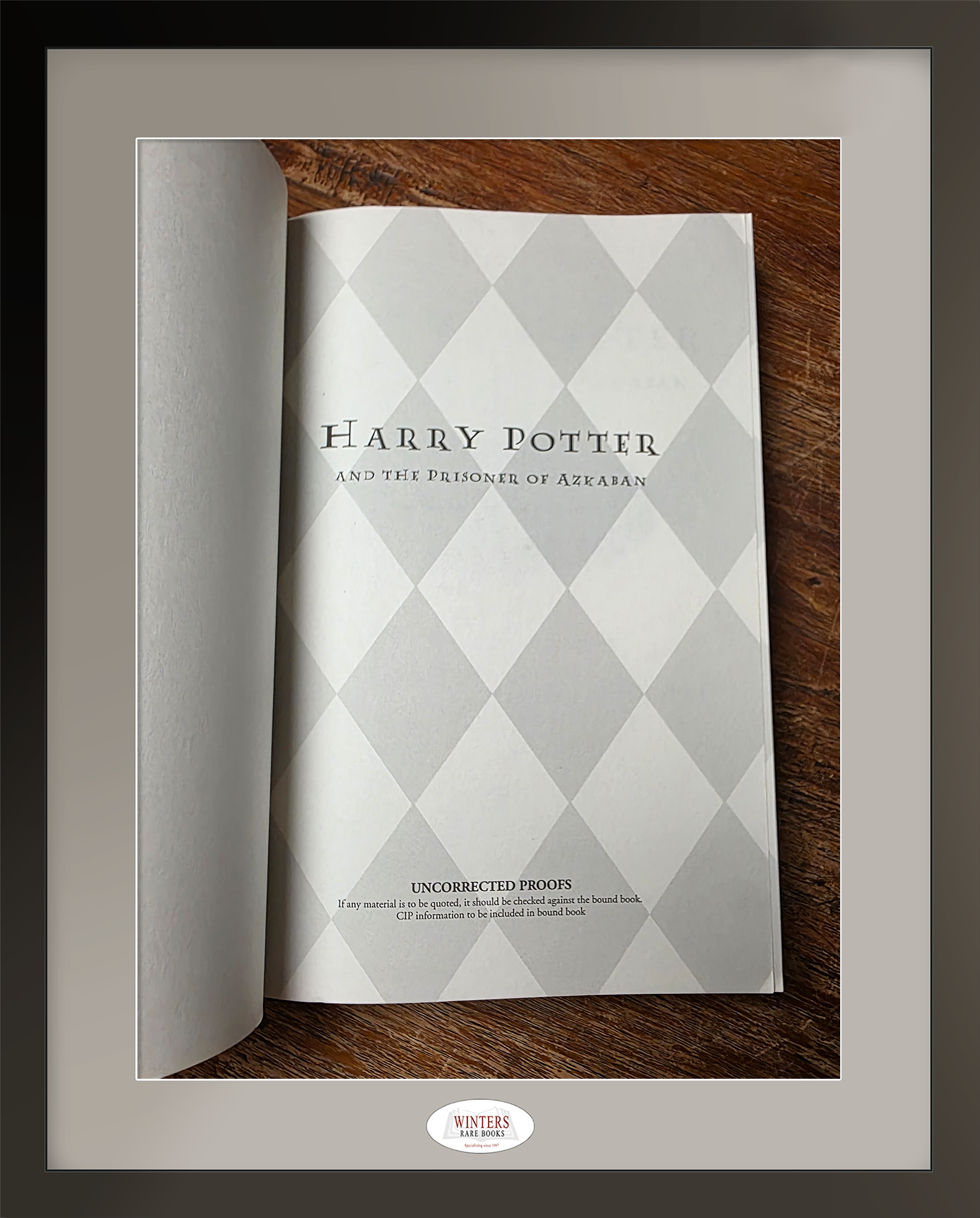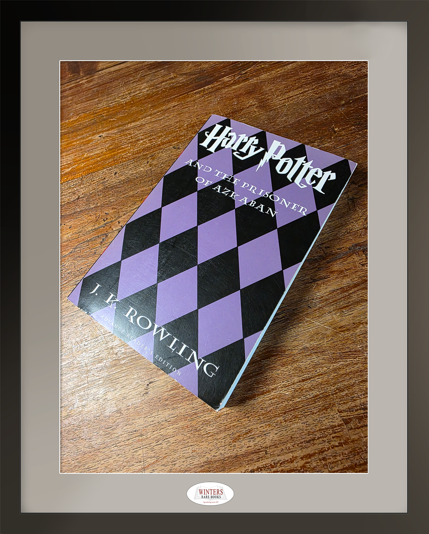 Since the final artwork was not yet ready when production began, the Prisoner of Azkaban proof copy does not feature the familiar illustrated cover. Instead, it has a distinctive purple and black diamond pattern. By the time of its publication, the Harry Potter phenomenon was already in full swing, leading to a first-print trade run of 500,000 copies—dwarfing the mere 3,000 proof copies produced.