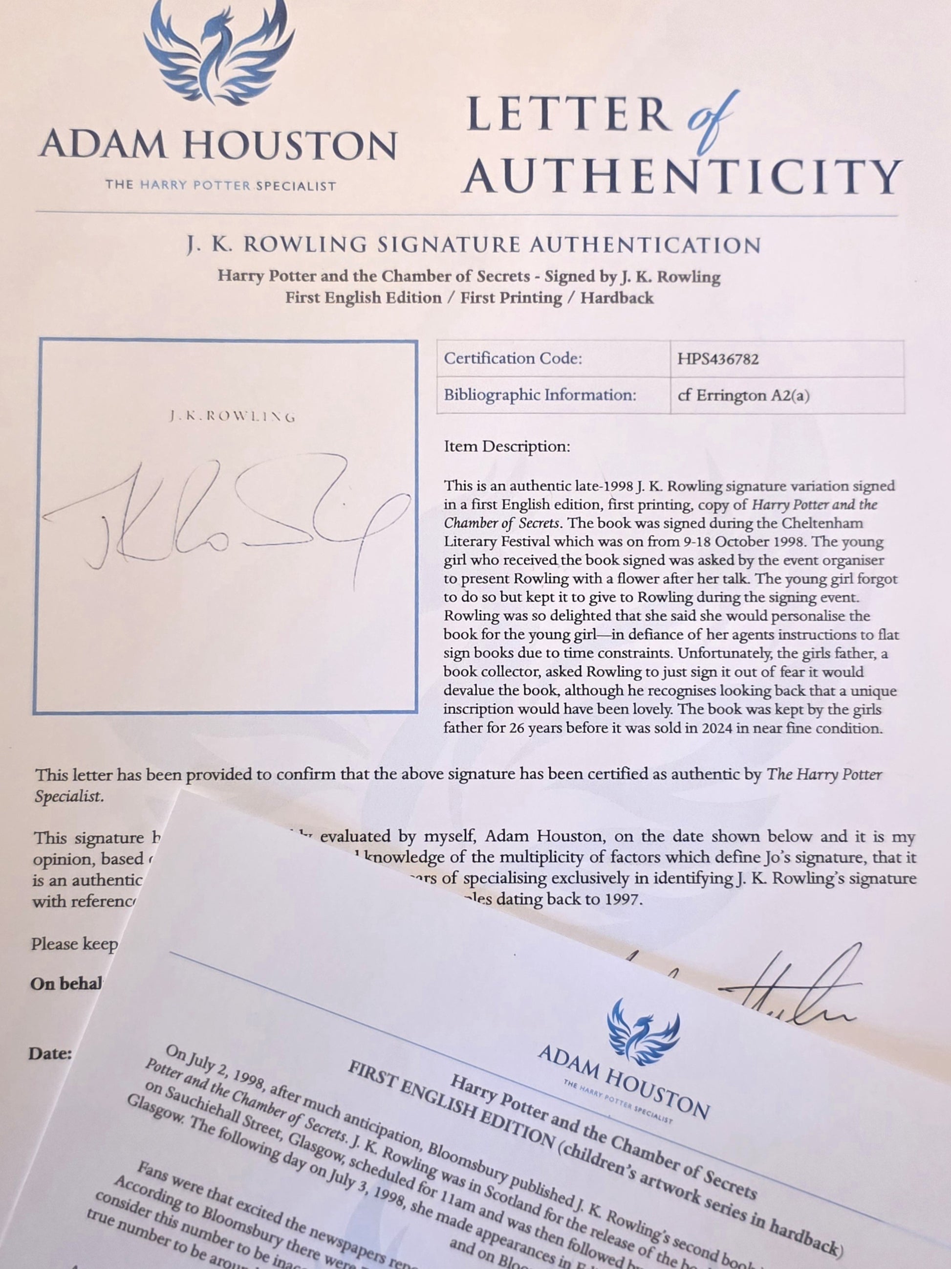 Included with the book is a handwritten letter from the previous owner, which narrates the delightful story behind the signing. At the event, the previous owner's youngest daughter was asked by the organizer to present a large plastic flower to J.K. Rowling at the end of her talk. However, as the children were leaving the hall, the young girl forgot to present the flower and instead held onto it tightly as she queued for the signing. J.K. Rowling was so charmed by this that she offered to write a special message in the book, despite her agent's suggestion to only sign her name due to time constraints. Being a book collector, the father respectfully requested just the signature. Fully authenticated by J.K. Rowling signature expert Adam Houston of The Harry Potter Specialist. Comes with a Letter of Authenticity and a collector’s card with interesting details.