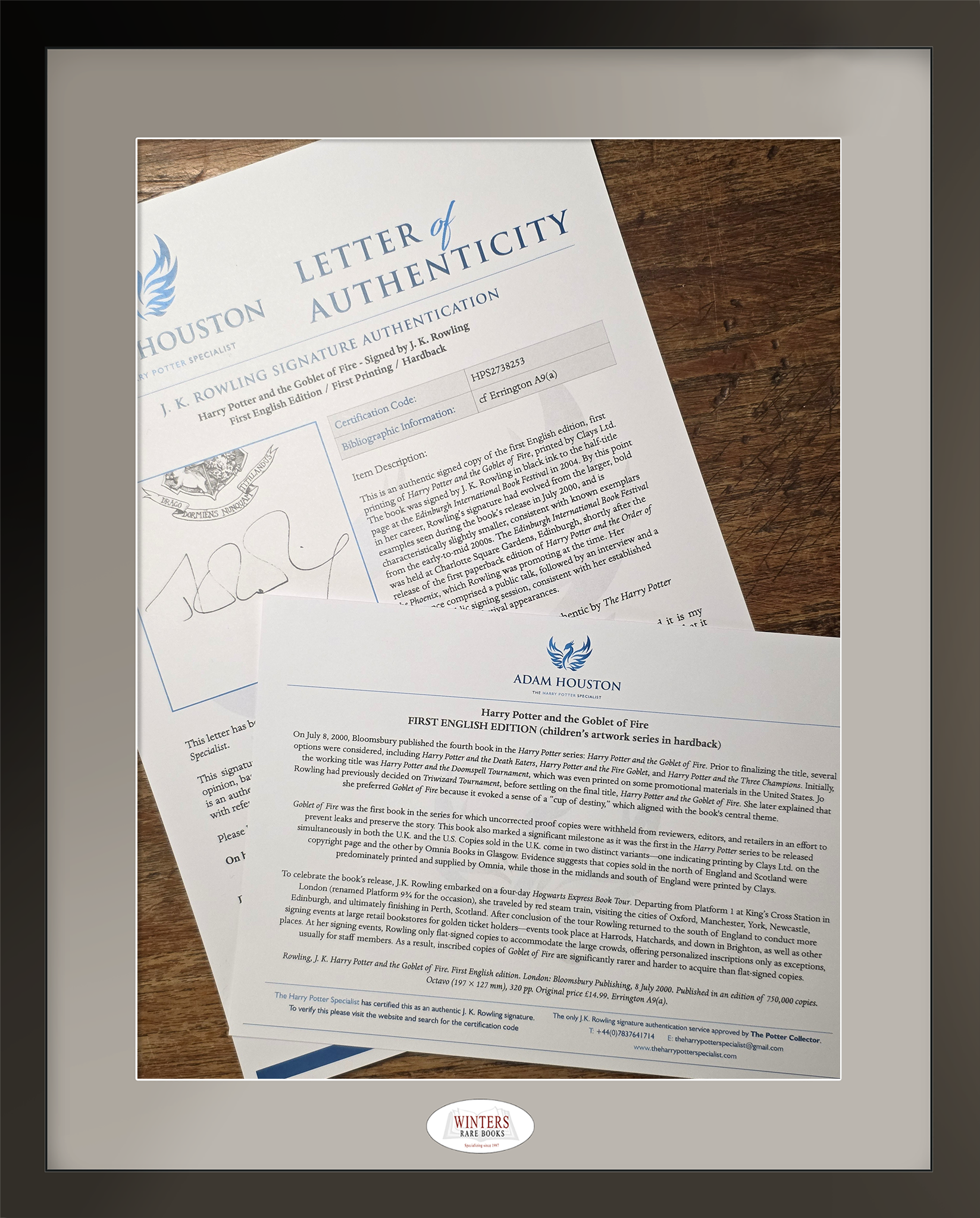 A desirable and genuinely scarce signed example of the fourth instalment in the Harry Potter series, distinguished by its unusual placement of the signature and its association with a recognised literary festival rather than a mass signing event. Accompanied by a Letter of Authenticity (LoA) from Adam Houston (TheHarryPotterSpecialist) — the world’s sole expert on J.K. Rowling’s signature — confirming the authenticity of the signature.