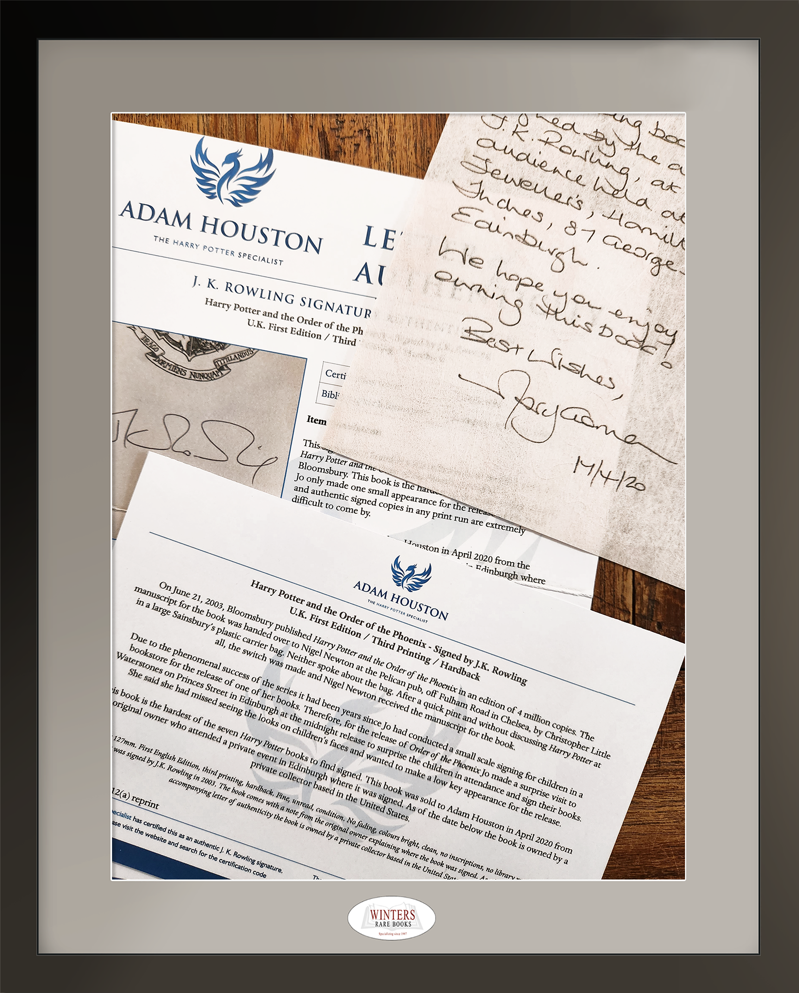 Accompanied by a letter from the original owner and a Letter of Authenticity (LoA) from Adam Houston of The Harry Potter Specialist, the world's sole expert on J.K. Rowling’s signature. Also included is an informative collector’s card providing additional details. It is housed in a beautiful, custom-made half-leather clamshell box.