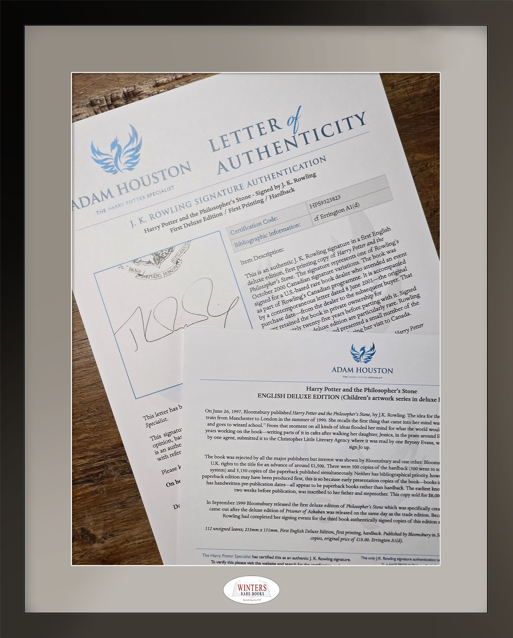 The book is accompanied by the original dealer’s letter to the subsequent buyer, as well as a Letter of Authenticity (LoA) from Adam Houston (TheHarryPotterSpecialist), the world’s sole expert on J.K. Rowling’s signature.