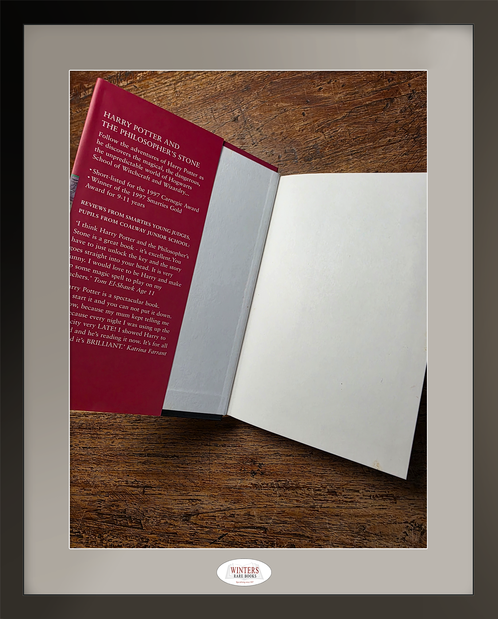 Scarce first Australian edition, first hardback printing of Harry Potter and the Philosopher?s Stone printed and published by Bloomsbury UK for the Australian market. Full number line 10 9 8 7 6 5 4 3 2 1. This version was the first to be issued with a dust jacket. We learned from a Bloomsbury contact that the print run was only 2.000 copies, which makes it a very rare book.