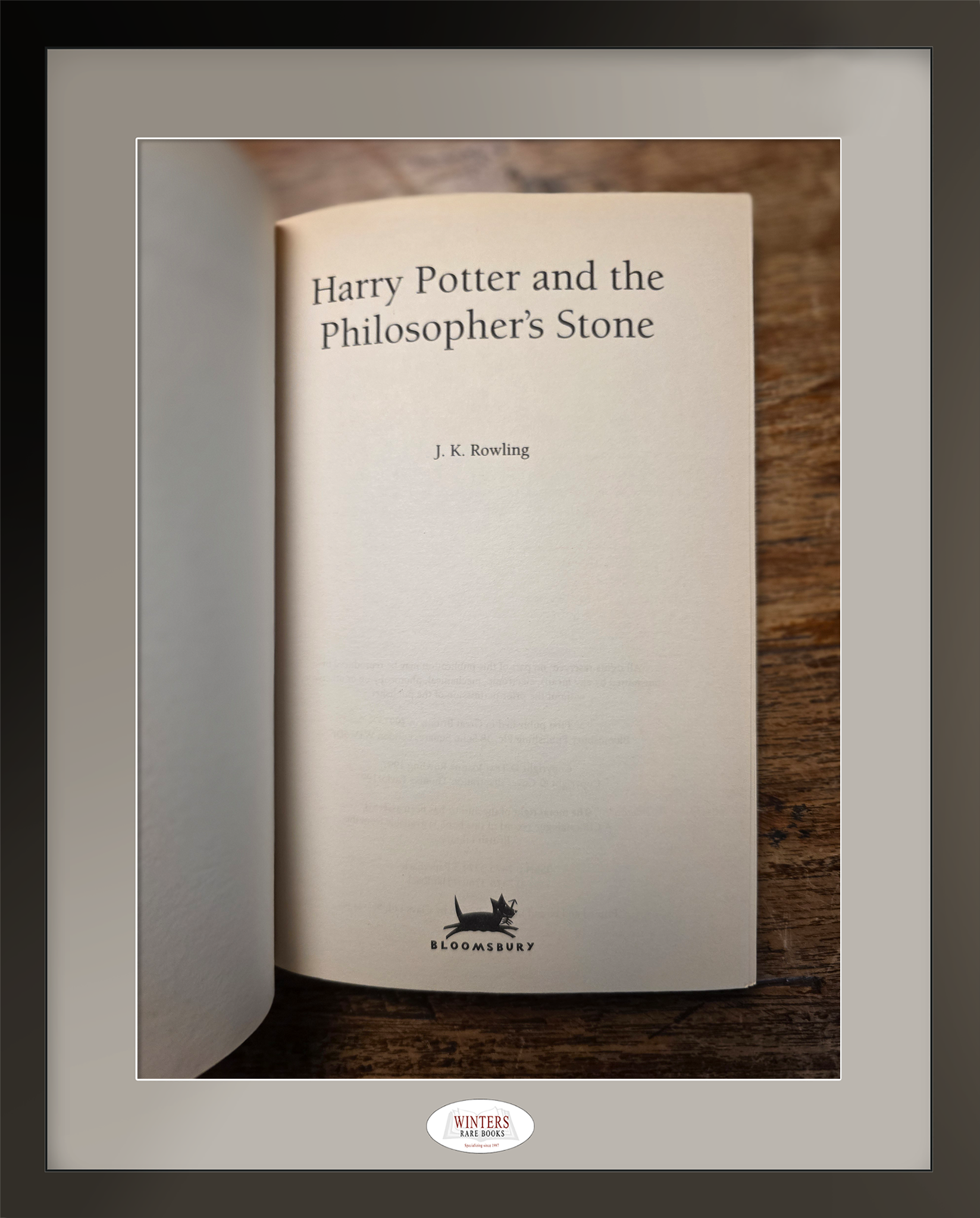 Near fine copy of the very scarce eighth UK Bloomsbury softcover printing of Harry Potter and the Philosopher's Stone. Number line 10 9 8; Sunday Telegraph review quote on the front cover; copyright page credits Joanne Rowling with no space between Thomas Taylor and the year.