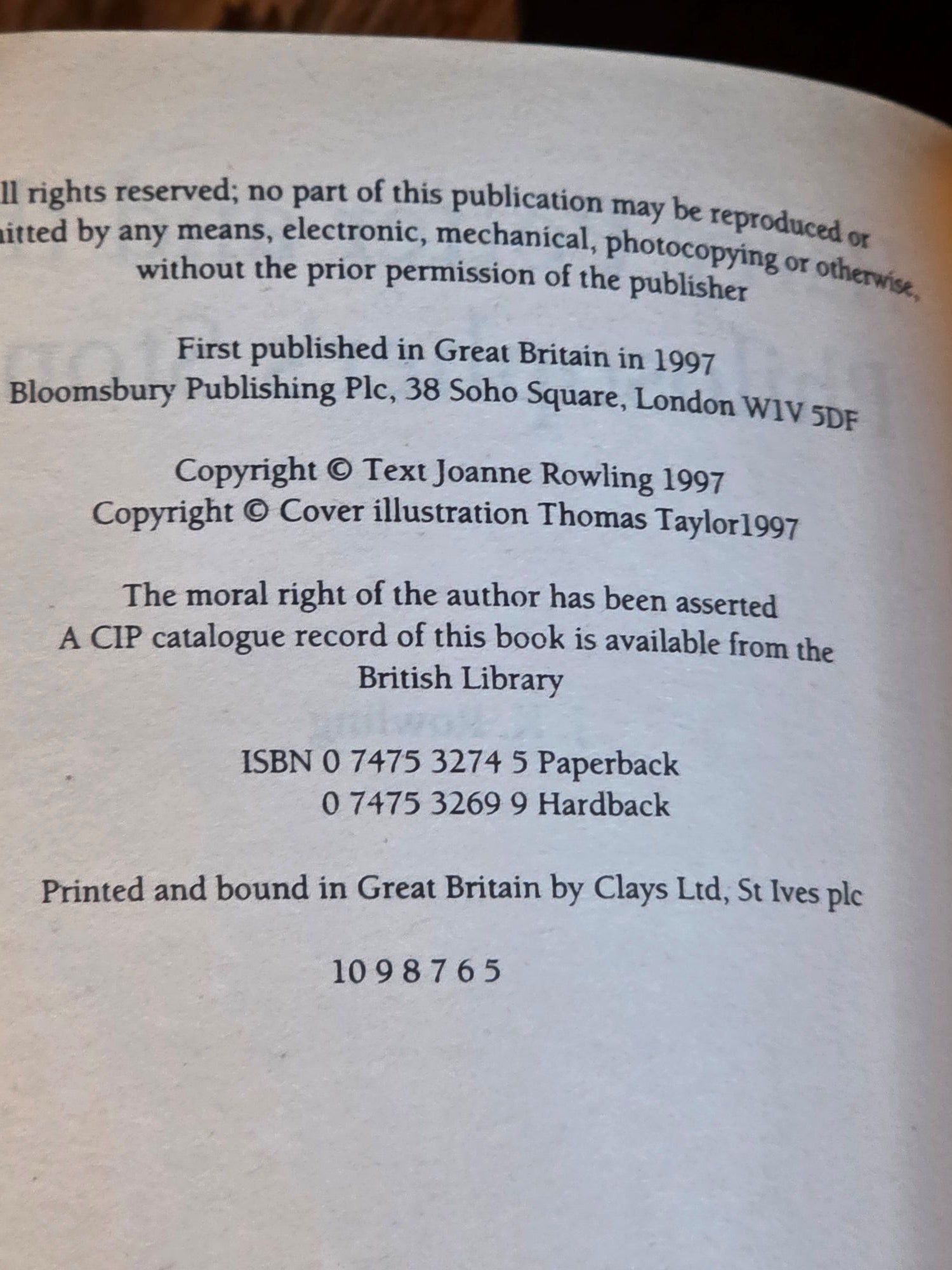 First edition, fifth UK Bloomsbury paperback printing of Harry Potter and the Philosopher's Stone. Number line: 10 9 8 7 6 5. Features the Wendy Cooling review on the front cover. The copyright page credits Joanne Rowling, with no space between Thomas Taylor and the year.