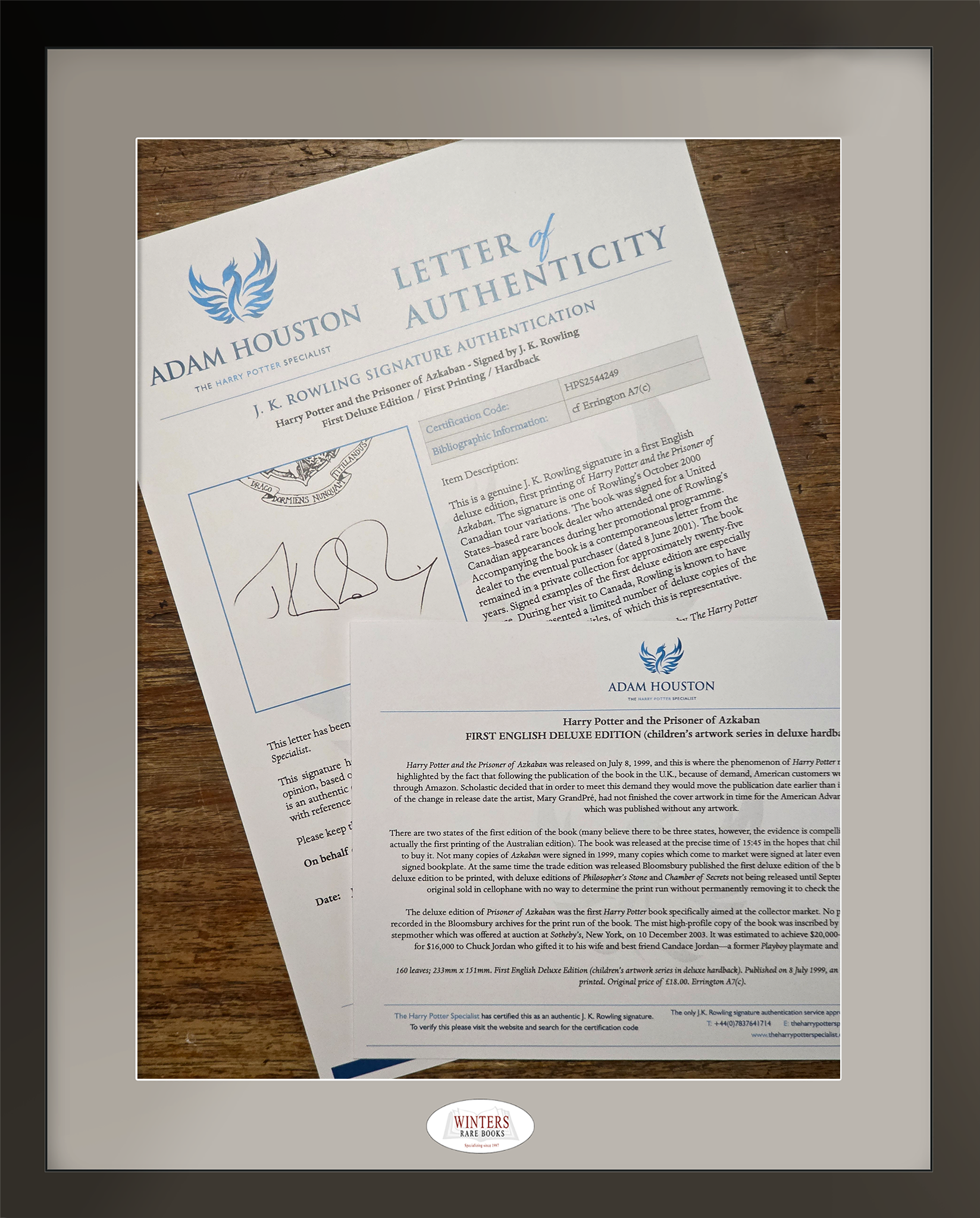 The book is accompanied by the original dealer's letter to the subsequent buyer, as well as a Letter of Authenticity (LoA) from Adam Houston (TheHarryPotterSpecialist), the world's sole expert on J.K. Rowling?s signature.