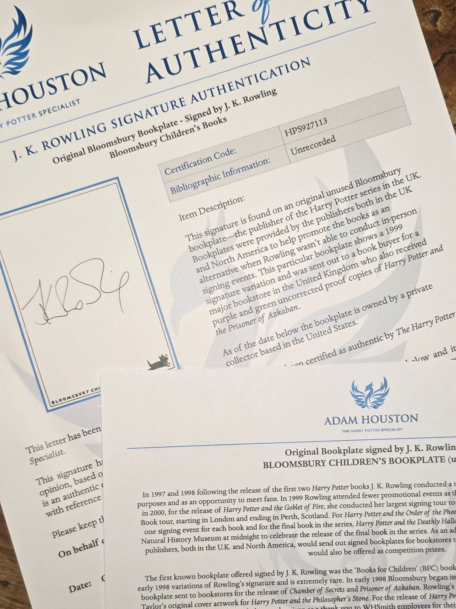 The book is housed in a custom-made full-leather clamshell box providing both elegant presentation and long-term protection. A Letter of Authenticity from Adam Houston of The Harry Potter Specialist accompanies the book and confirms the authenticity of the signature.
