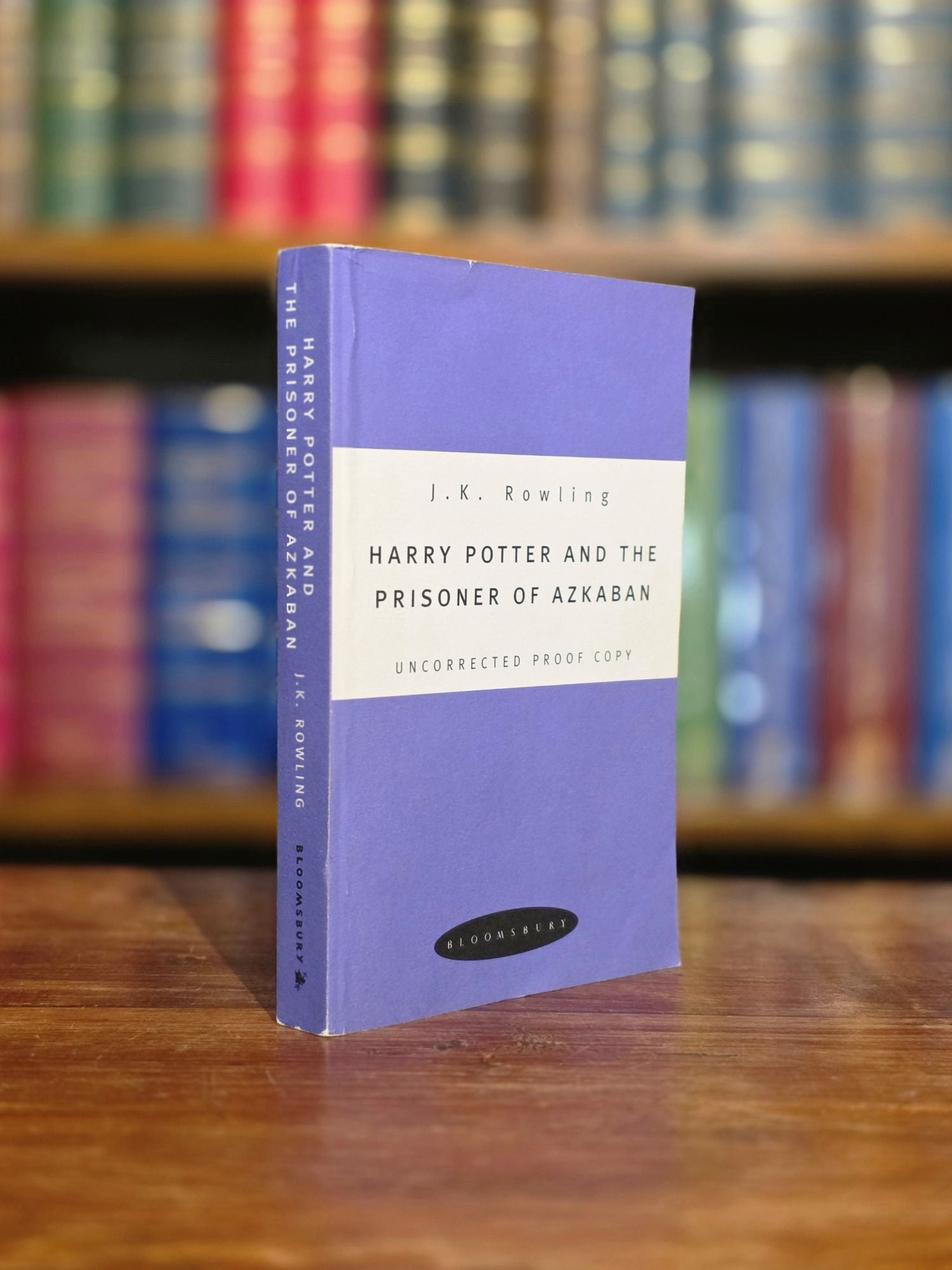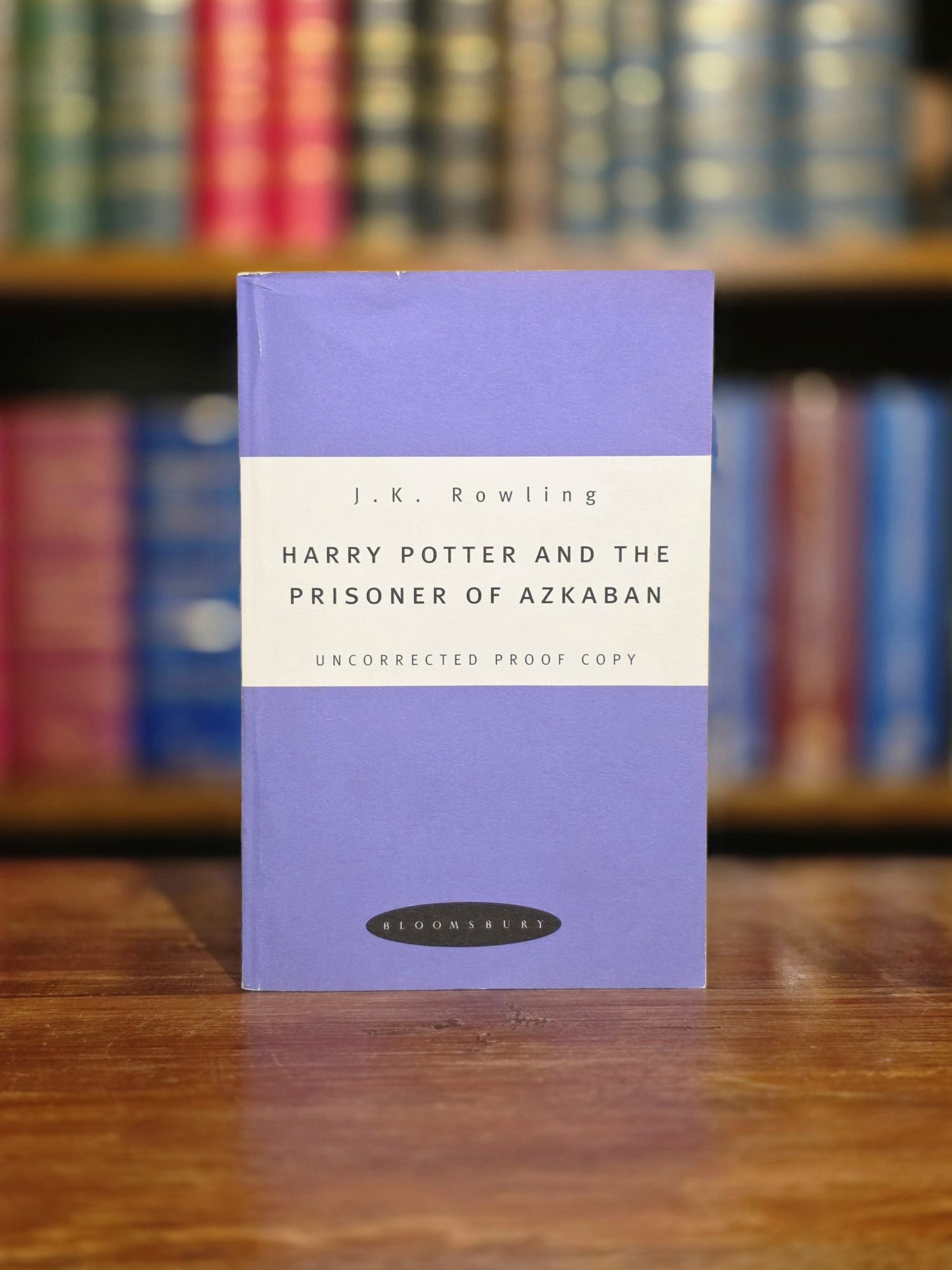 One of only 31 copies of the purple-wrapper uncorrected proof of Harry Potter and the Prisoner of Azkaban, the earliest proof state of the third novel in the Harry Potter series. Accompanying the proof is a Bloomsbury bookplate signed by J.K. Rowling. Unlike most surviving examples encountered today, this bookplate has never been pasted into a book and remains preserved in its original unused state, an uncommon survival.