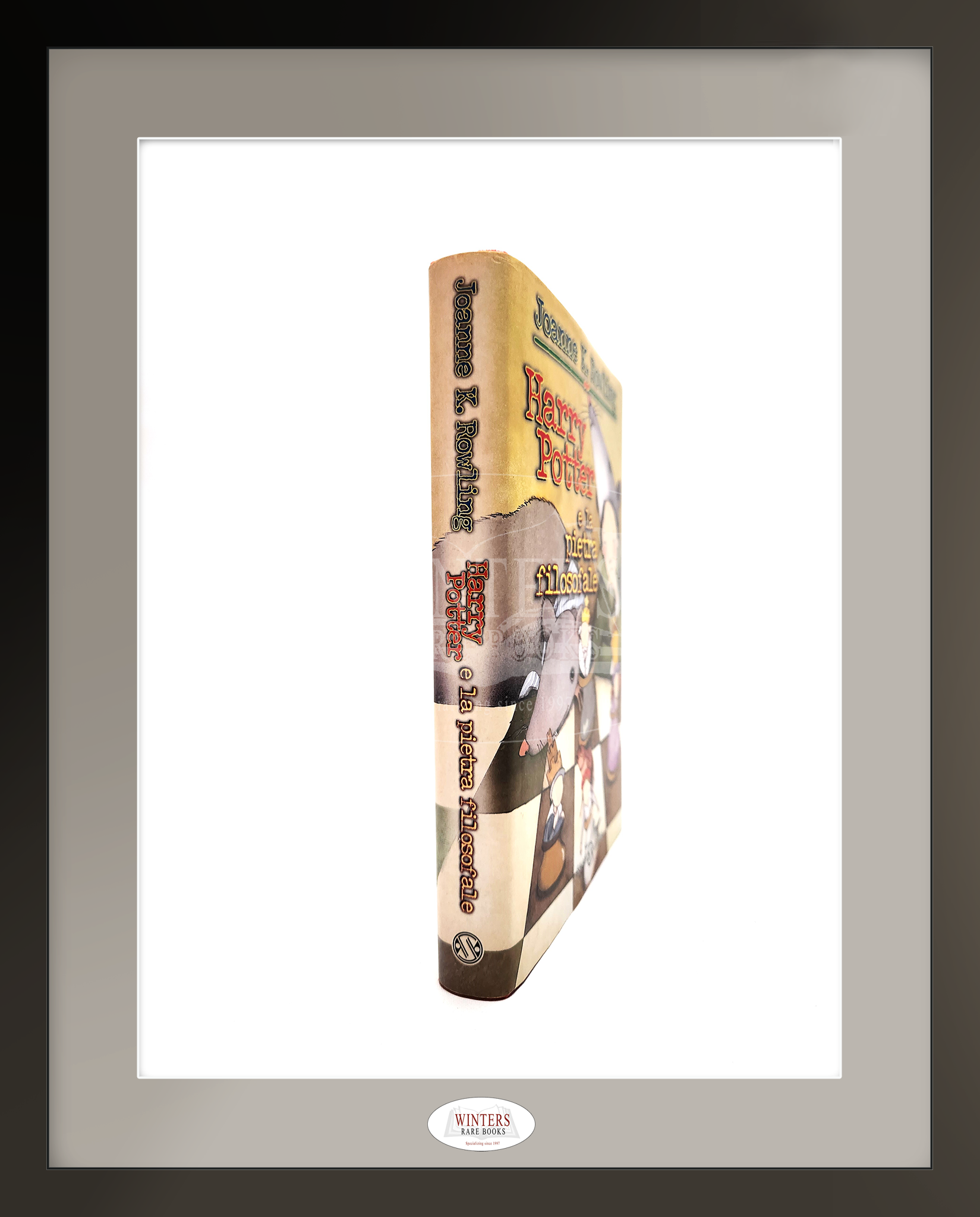 Harry Potter and the Philosopher's Stone, Salani 1998. First Italian edition, first printing, illustrated by Serena Riglietti, who was not well informed about the story and therefore made a rather bizarre cover illustration of Harry wearing a strange hat in the shape of a mouse's head and without his signature glasses, accompanied by a huge mouse. These deviations, plus the fact that it was one of the first translations of Harry Potter due to its publication only ten moths after the first UK edition, make this rather special edition a very popular collector's item.
