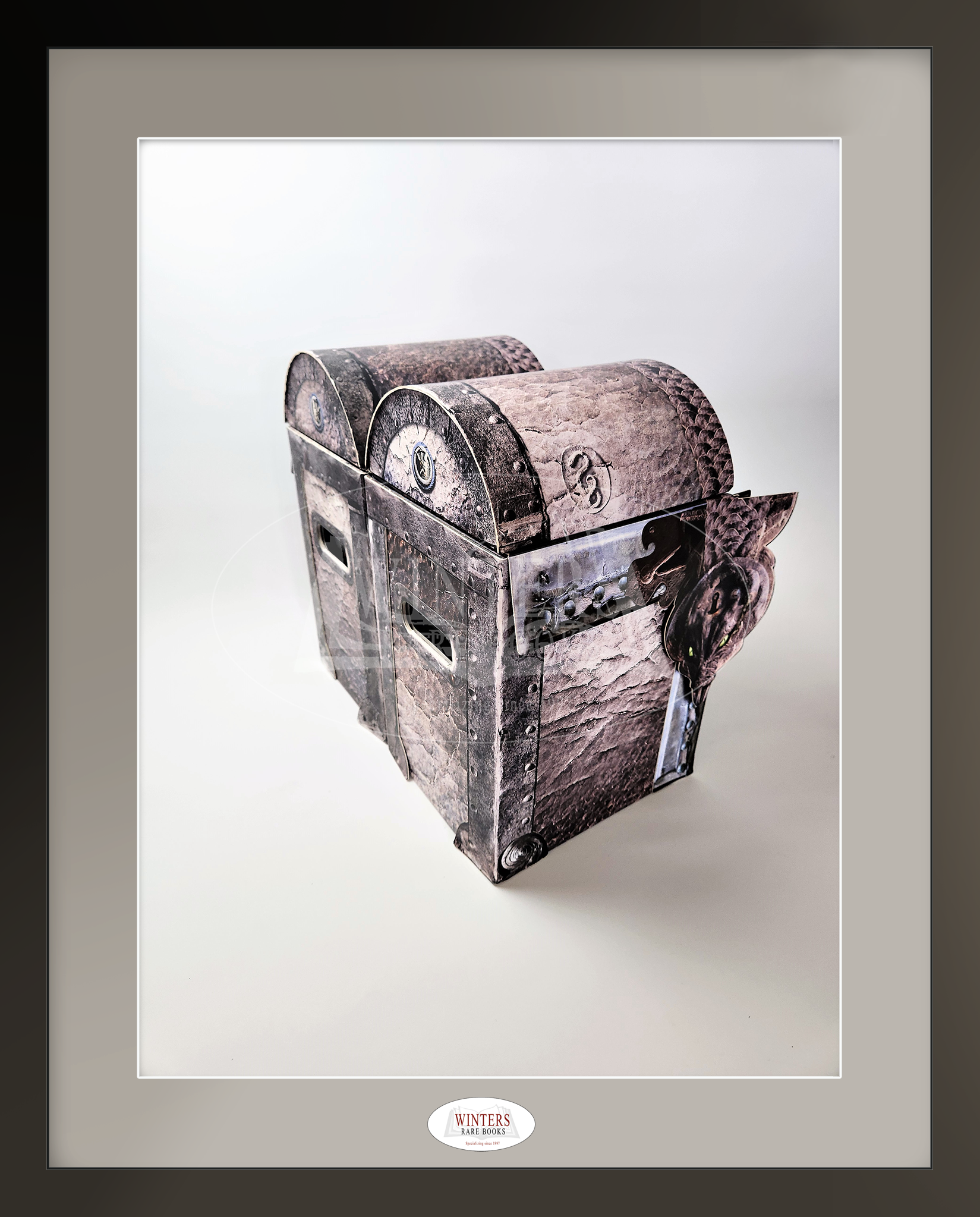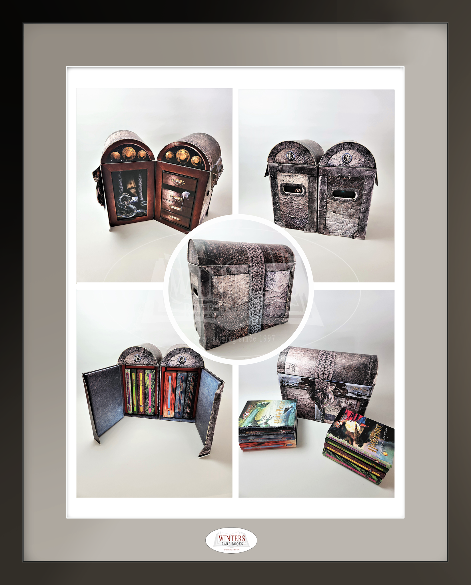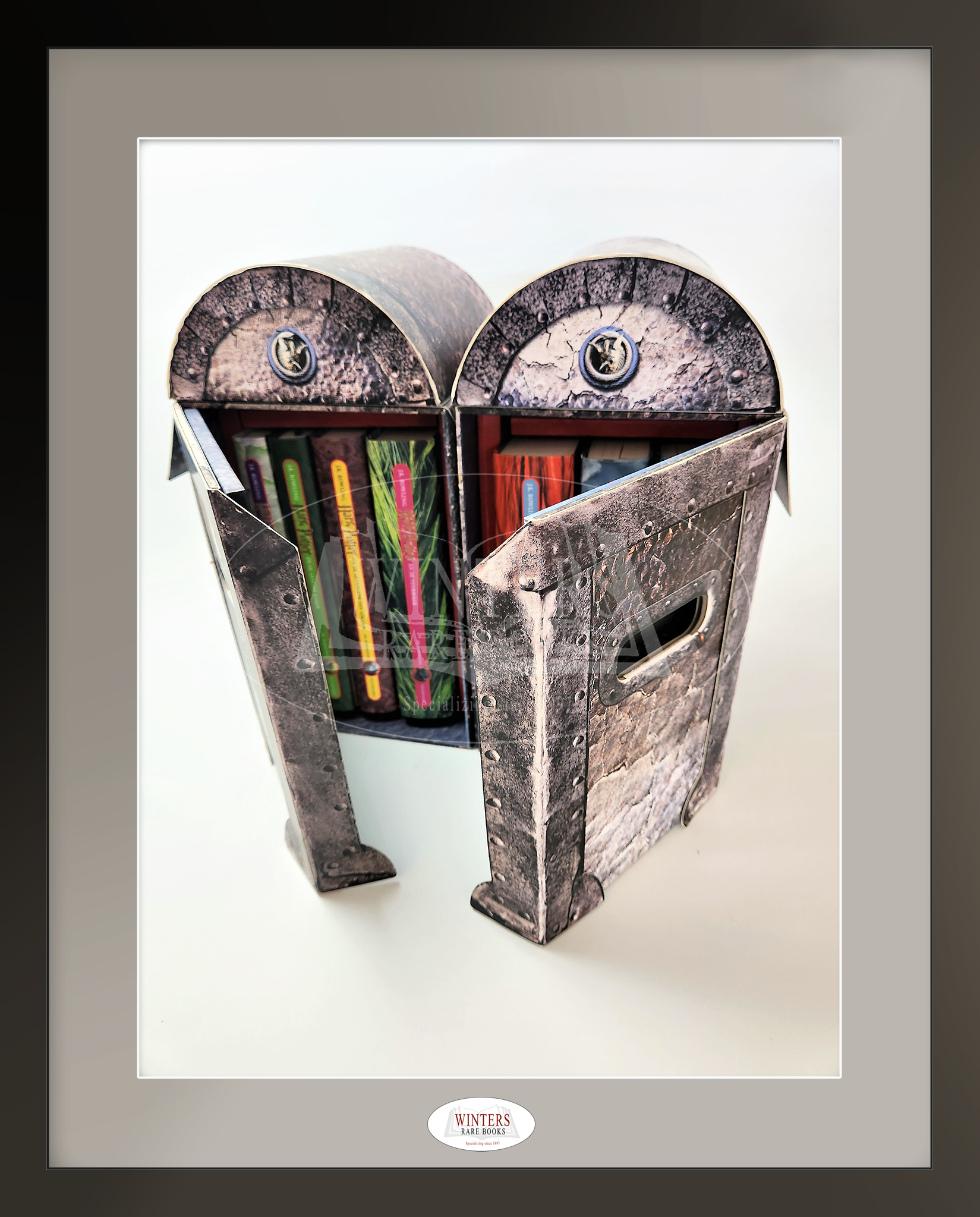 Limited edition 10th Anniversary Box set of the Dutch Harry Potter books. This limited set was published in 2008 in a very small edition. The books are hidden in a stunning treasure vault that was designed by Ien van Laanen, the price winning artist who also designed the cover illustrations of the first edition Hardbacks that are stored in the vault.