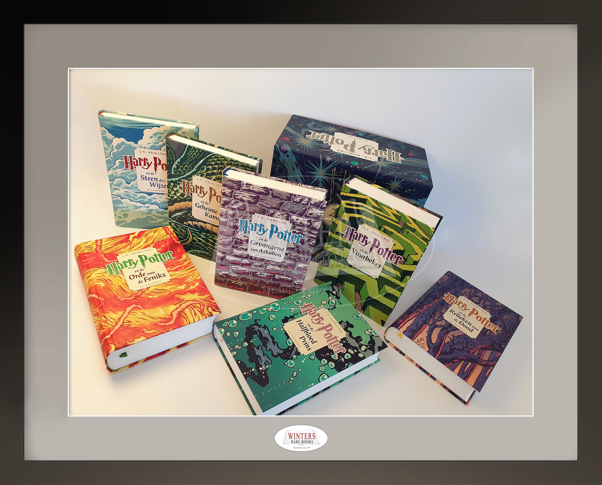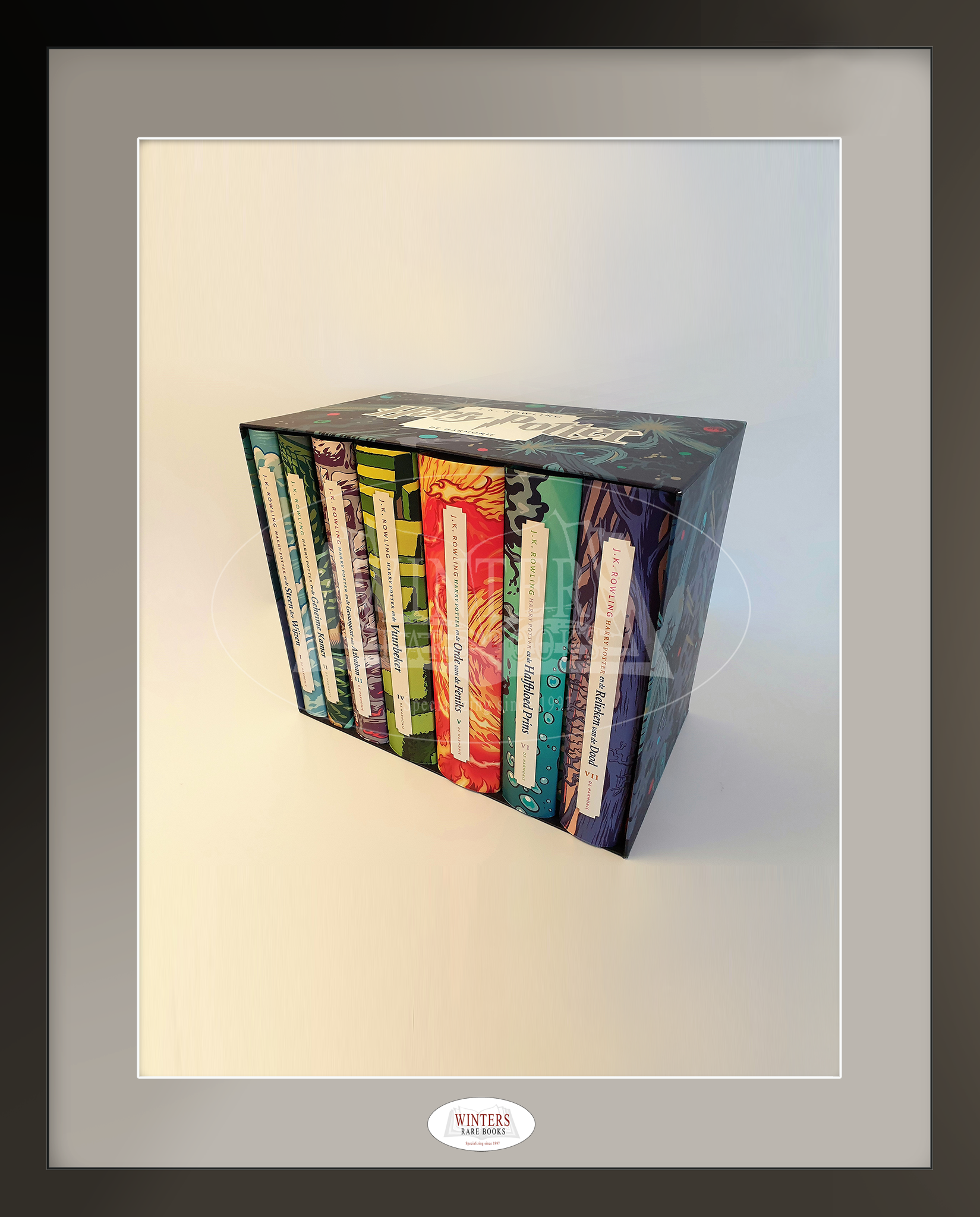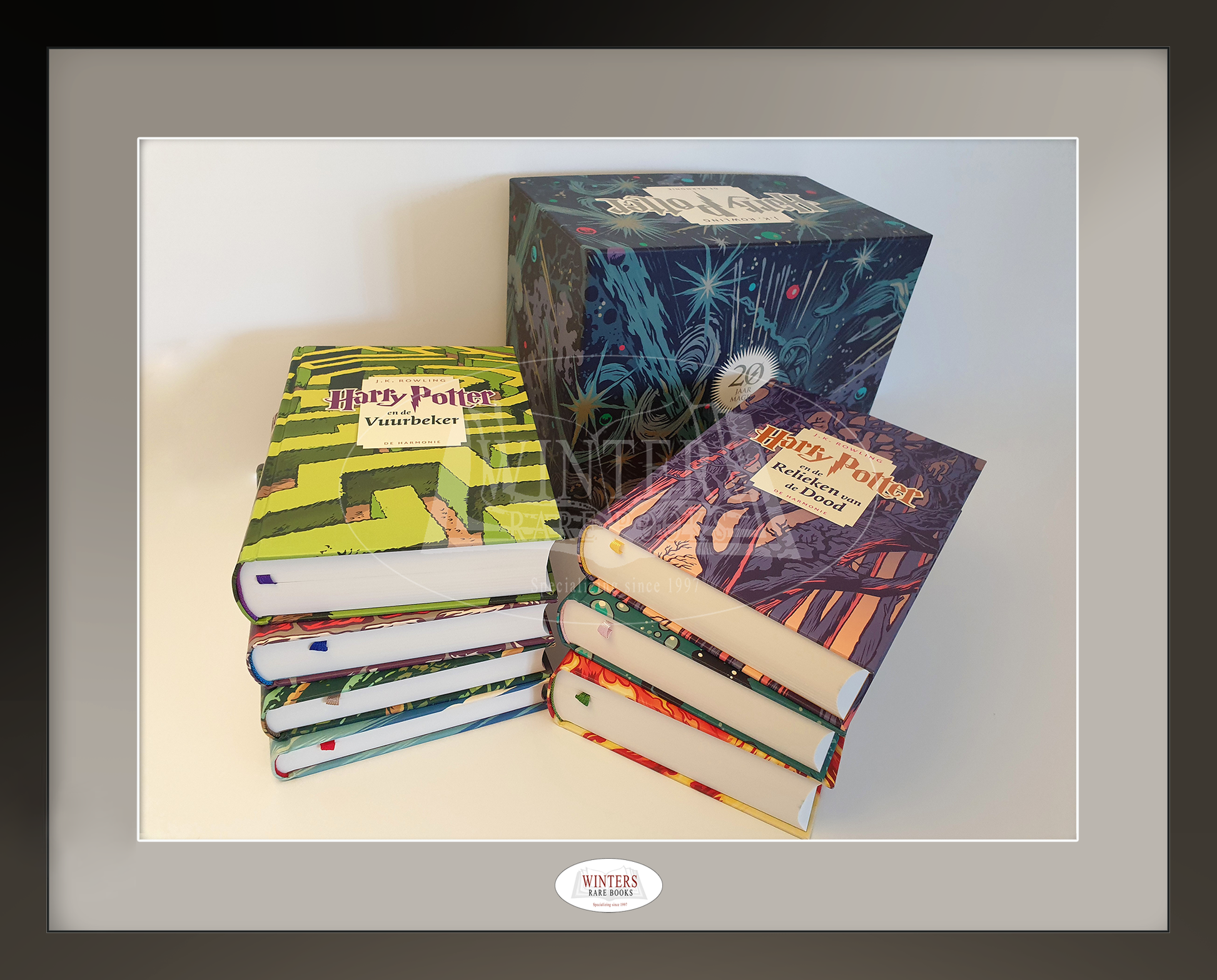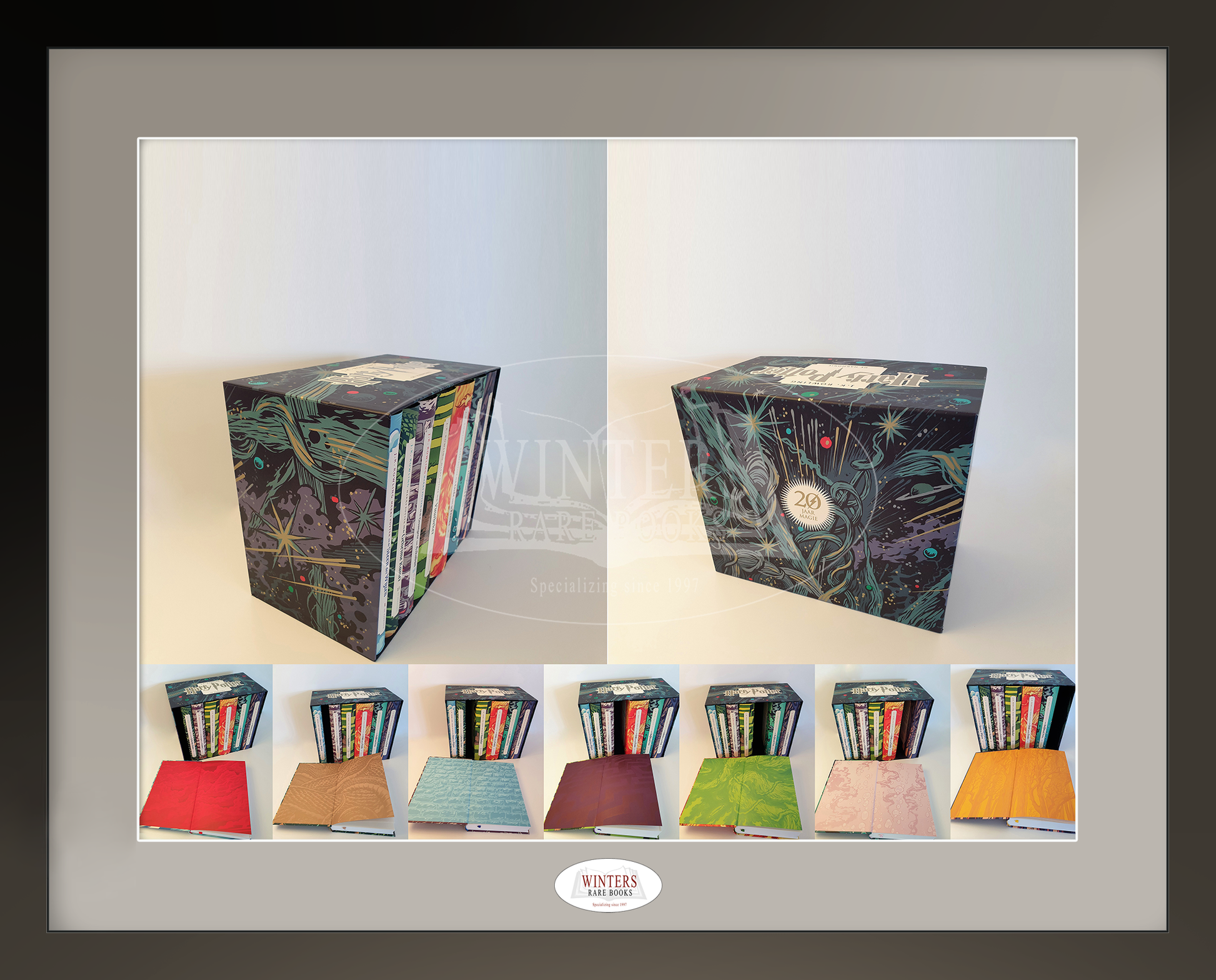 Limited edition 20th Anniversary Box Set of the Dutch Harry Potter books. Original 2018 promotional poster included. This limited set was published in August 2018 in a small edition and became very beloved by Potter bibliophiles around the world. It is widely regarded as one of the most beautiful sets ever made. The beautiful box features original illustrations, which match the covers The illustrated endpapers of each part have the same color as the marker ribbon and the title of the book in question. The cover art was previously used for the Dutch Pocket Editions which were published in 2013 . These hardbacks only exist as part of the anniversary set and were not sold separately. Box and books are in unread, pristine condition. This amazing set makes a great addition to any Harry Potter collection