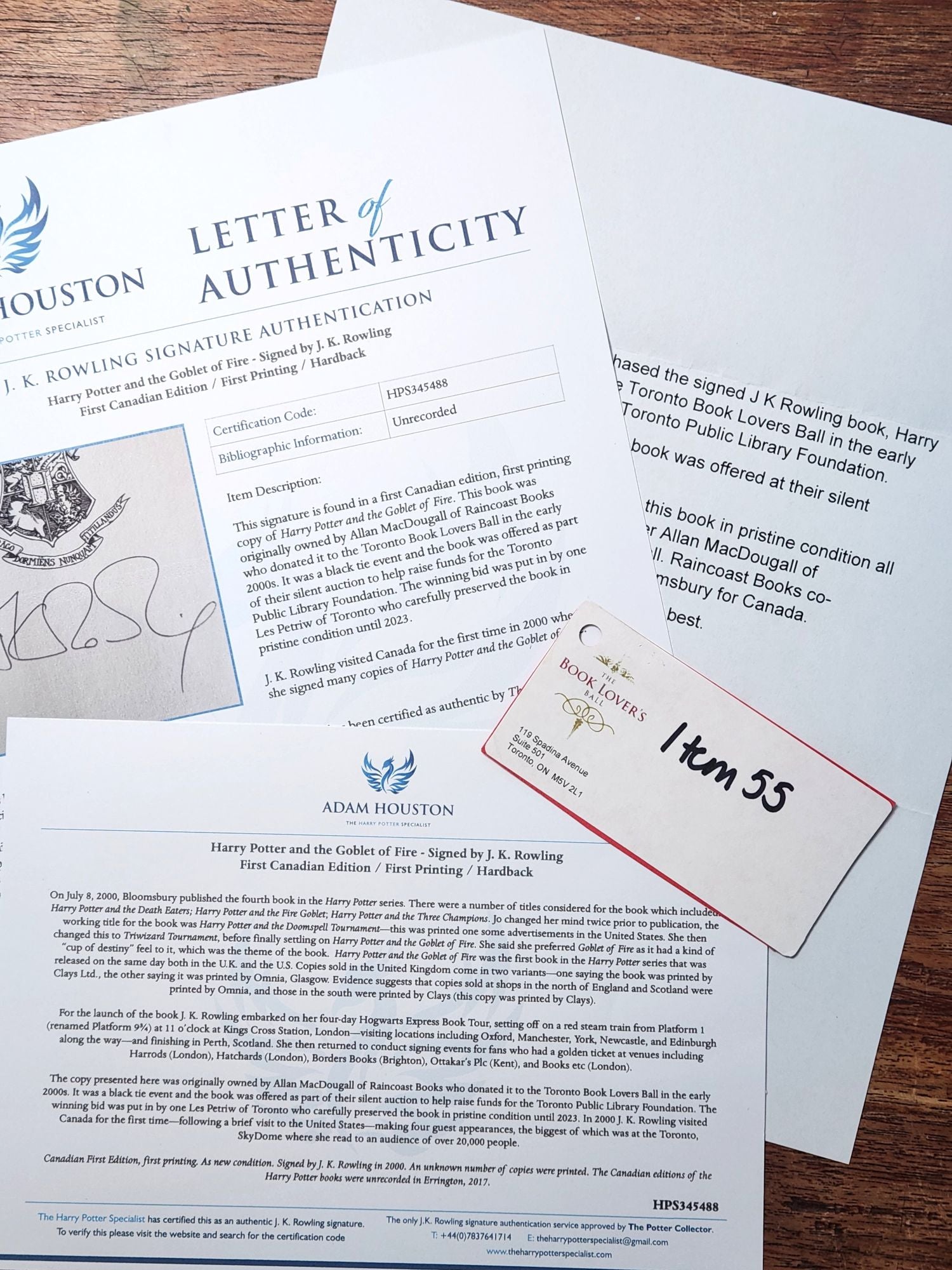 This particular copy was donated by Allan MacDougall, the Canadian publisher of the Harry Potter series in 2000, for a silent auction at the Toronto Book Lovers’ Ball — an annual black-tie fundraiser supporting the Toronto Public Library Foundation. The winning bid was placed by Les Petriw, who has carefully preserved the book and its dust jacket in pristine condition. Included are a letter from the previous owner and the original auction lot label.