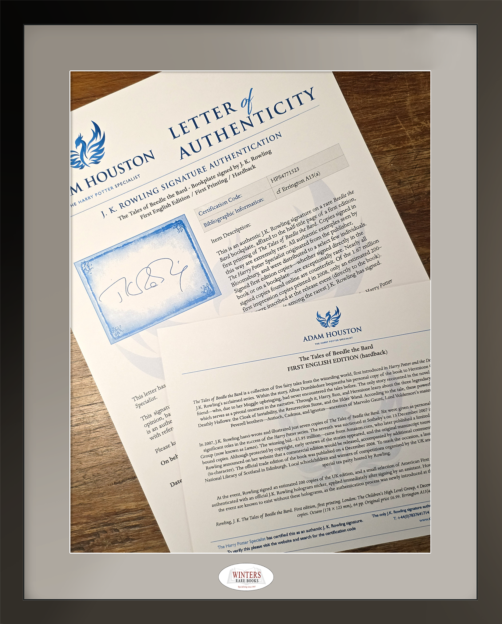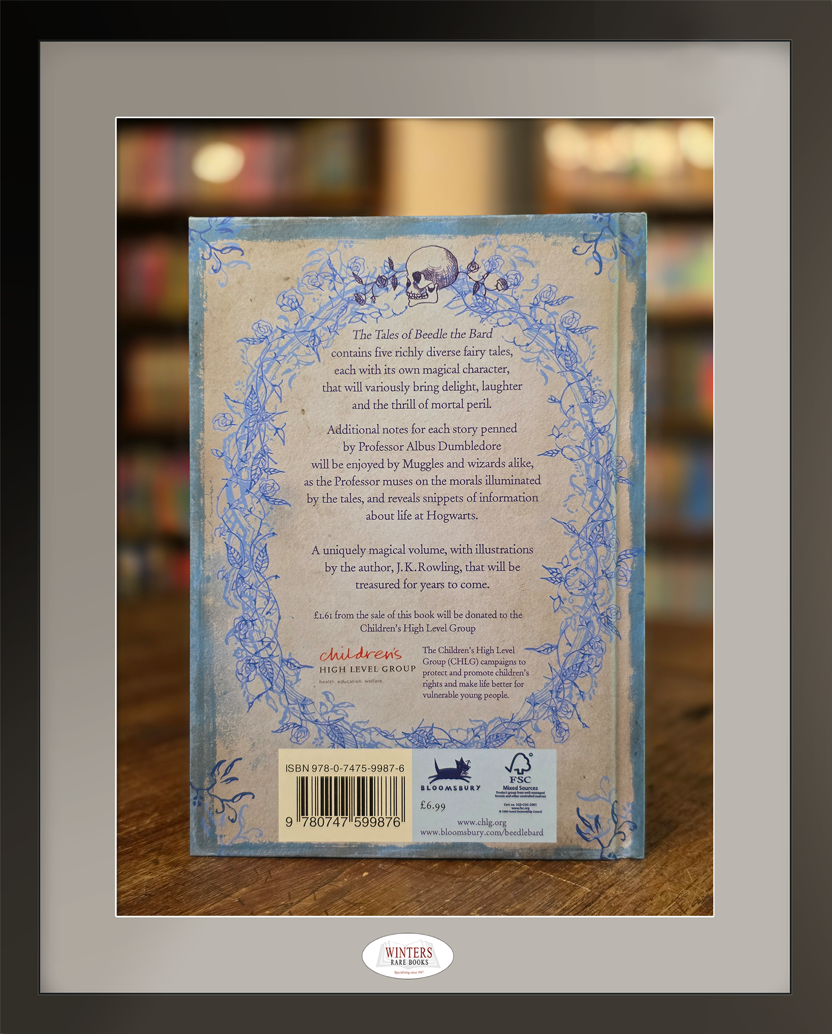 First edition, first printing of the UK edition of The Tales of Beedle the Bard, published on 4 December 2008. The book is signed on an ultra-rare Beedle the Bard bookplate affixed to the half-title page.