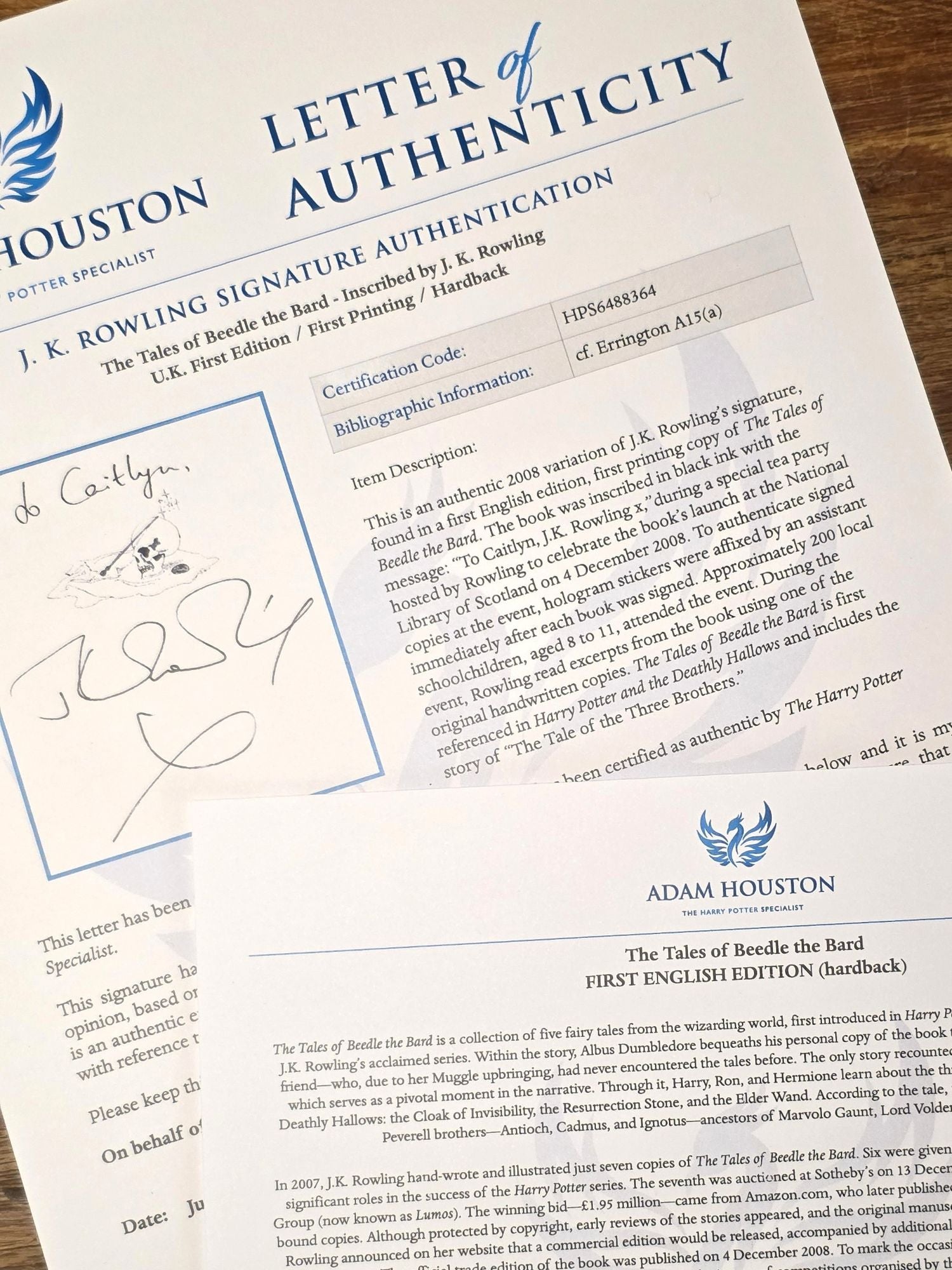 Given the scarcity of signed copies and the fact that The Tales of Beedle the Bard is one of the most frequently forged signed titles in Rowling’s catalog, this authentic copy represents a unique and valuable opportunity for collectors.