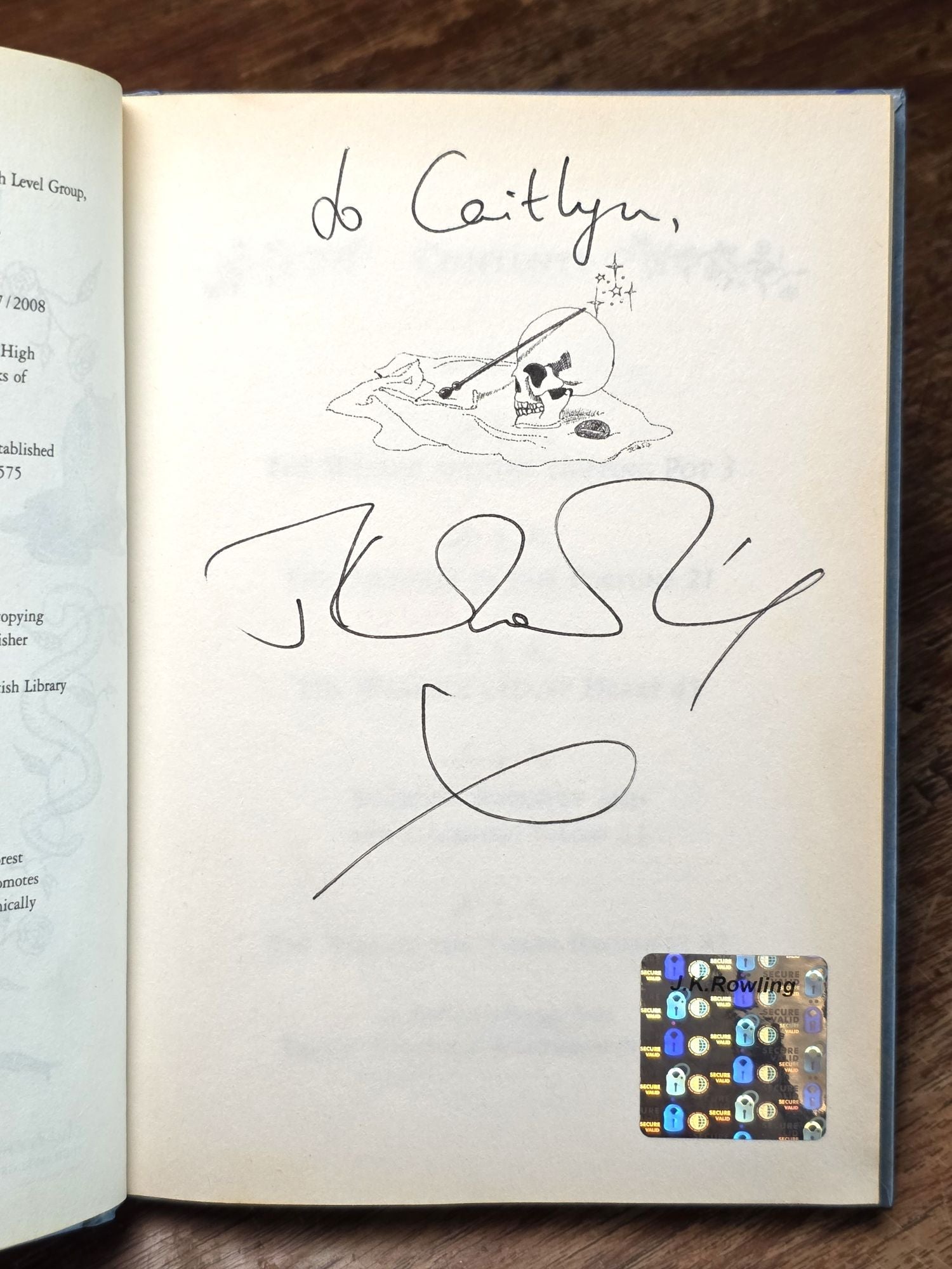 Fine copy of an exceptionally scarce, authentically inscribed and signed [ ‘To Caytlin, J.K. Rowling’] first edition, first printing of The Tales of Beedle the Bard. This highly sought-after collector’s item was signed by J.K. Rowling during the launch event on 4 December 2008, held at the National Library of Scotland in Edinburgh. The event featured a private reading by Rowling, and the children invited to attend were selected through a random ballot. Up to 20 pupils from 10 local schools, aged eight to 11, had the unique opportunity to participate. This copy bears the hologram that was to authenticate signed copies at this event, however, these holograms were placed in the book after signing by an assistant and a number of copies are known to have been signed but did not receive a hologram.